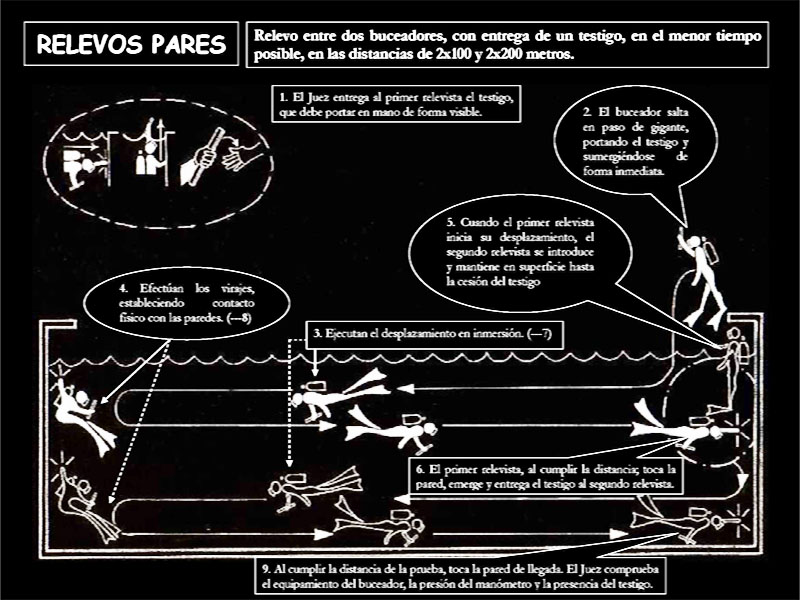 Las 4 Pruebas de Equipo se denominan Relevos Pares 2x100/2x200 metros; Calume 50/100 metros; Rescate: Maniquí 2x100 metros/ Buceador Agotado 2x100 metros y la prueba Briefing.