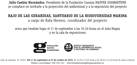 El día 17 de Septiembre a las 19:30 h. en el aula magna y la sala de exposiciones tiene lugar la exposición fotográfica y la proyección audiovisual Bajo las gerardias. Documental de bellísimas imágenes de una de las zonas de mas valor en relación a la población de corales en las Islas Canarias.