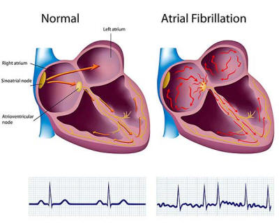 La fibrilación auricular (FA) es uno de los trastornos del ritmo cardíaco más comunes de la clínica cardiológica. Básicamente, las aurículas (las dos cámaras superiores del corazón) vibran en lugar de contraerse y latir en una forma organizada. Esto conlleva a un ritmo cardíaco rápido e irregular que puede ser un poco incómodo (aunque no todas las personas presentan síntomas) y puede colocar a los pacientes en un incremento significativo del riesgo de padecer un accidente cerebrovascular. Los factores de riesgos para el desarrollo de una fibrilación auricular son la hipertensión arterial, la enfermedad coronaria (angina de pecho) subyacente, la edad avanzada y aquellas enfermedades que afecten las válvulas cardíacas.